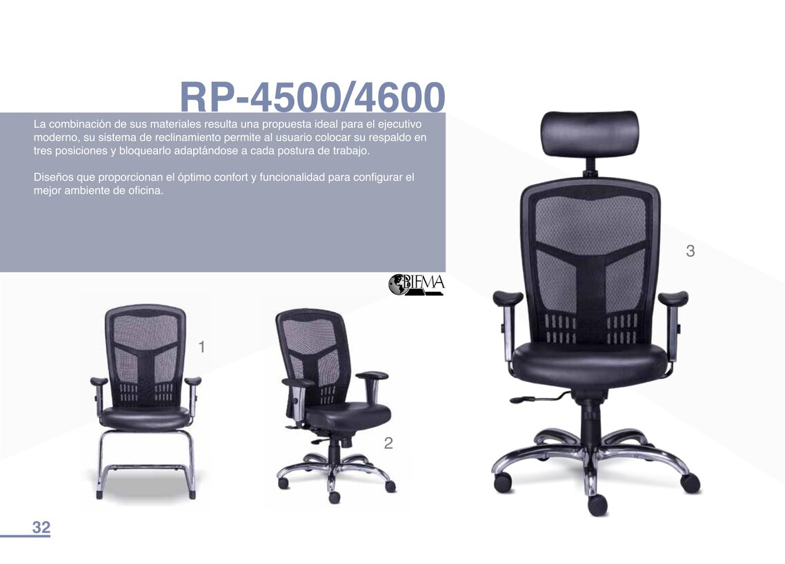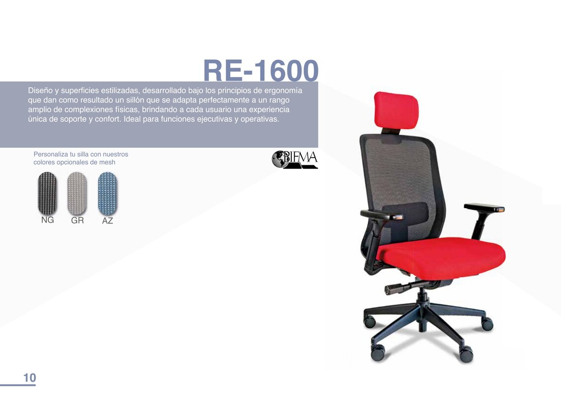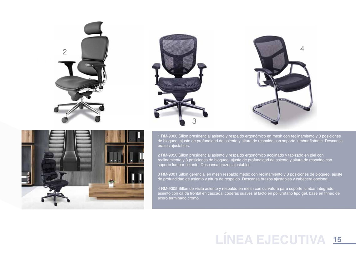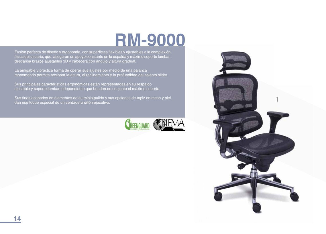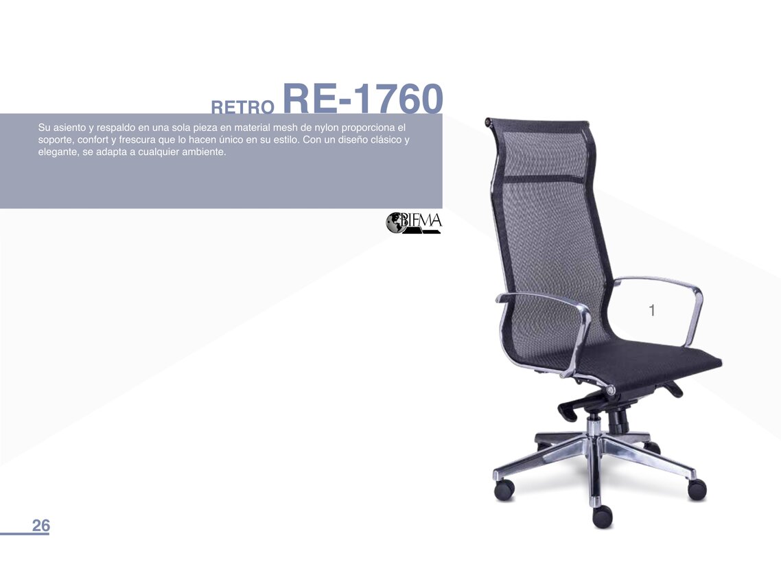 Sillón ejecutivo en mesh con diseño ergonómico. Su mecanismo cuenta con reclinamiento synchro autopesante, con 3 ángulos de reclinamiento con bloqueo a través de un maneral para regular la tensión, profundidad de asiento slider y brazos fijos. El asiento es ergonómico con acojinamiento elaborado en poliuretano inyectado de alta densidad con retardante al fuego y sus rodamientos duales de nylon recubiertas de poliuretano suave para piso duro.