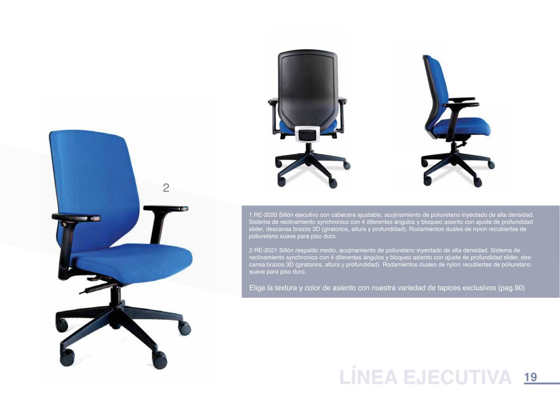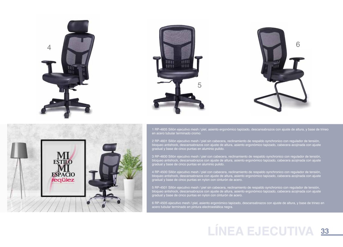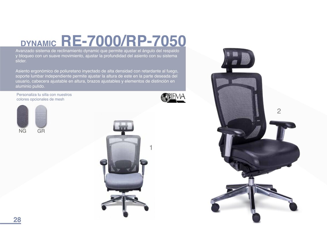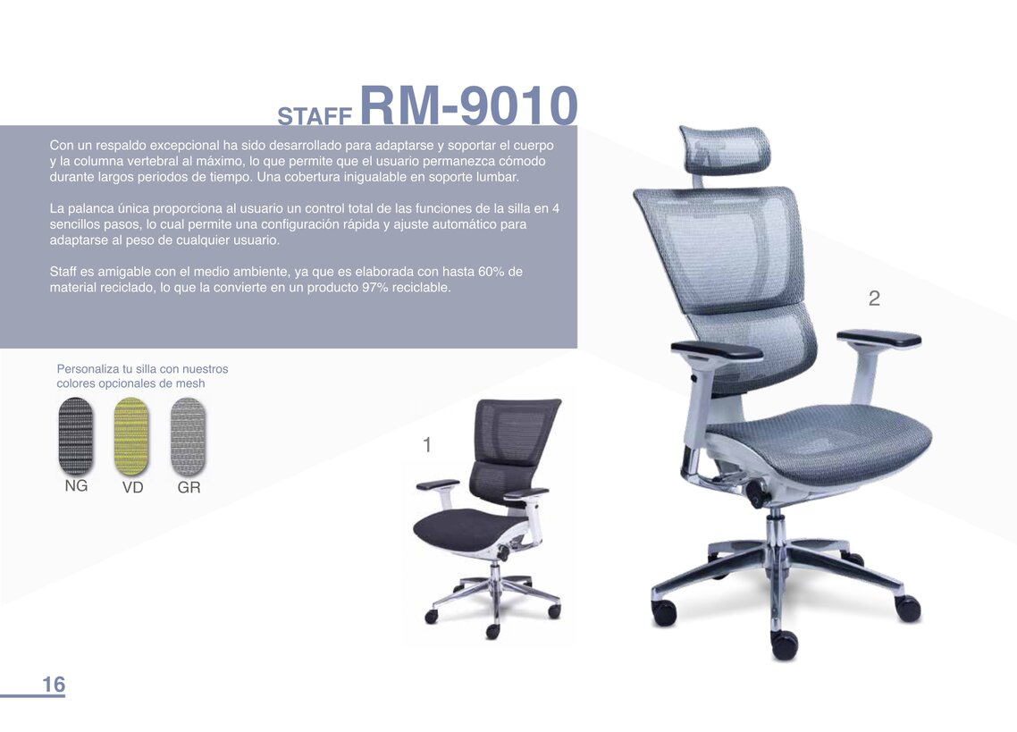 Sillón ejecutivo en mesh con diseño ergonómico. Su mecanismo cuenta con reclinamiento synchro autopesante, con 3 ángulos de reclinamiento con bloqueo a través de un maneral para regular la tensión, profundidad de asiento slider y brazos fijos. El asiento es ergonómico con acojinamiento elaborado en poliuretano inyectado de alta densidad con retardante al fuego y sus rodamientos duales de nylon recubiertas de poliuretano suave para piso duro.