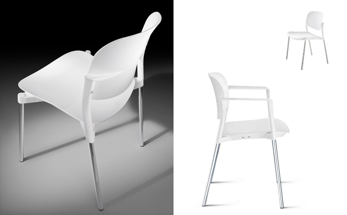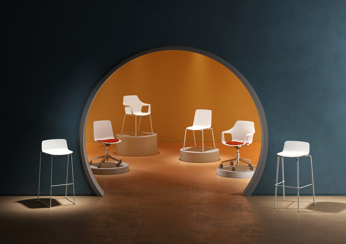 VESPER es una gama de productos formada por sillas, sillones y taburetes, cuyos cascos son de polipropileno reforzado con fibra de vidrio y la estructura de metal.
