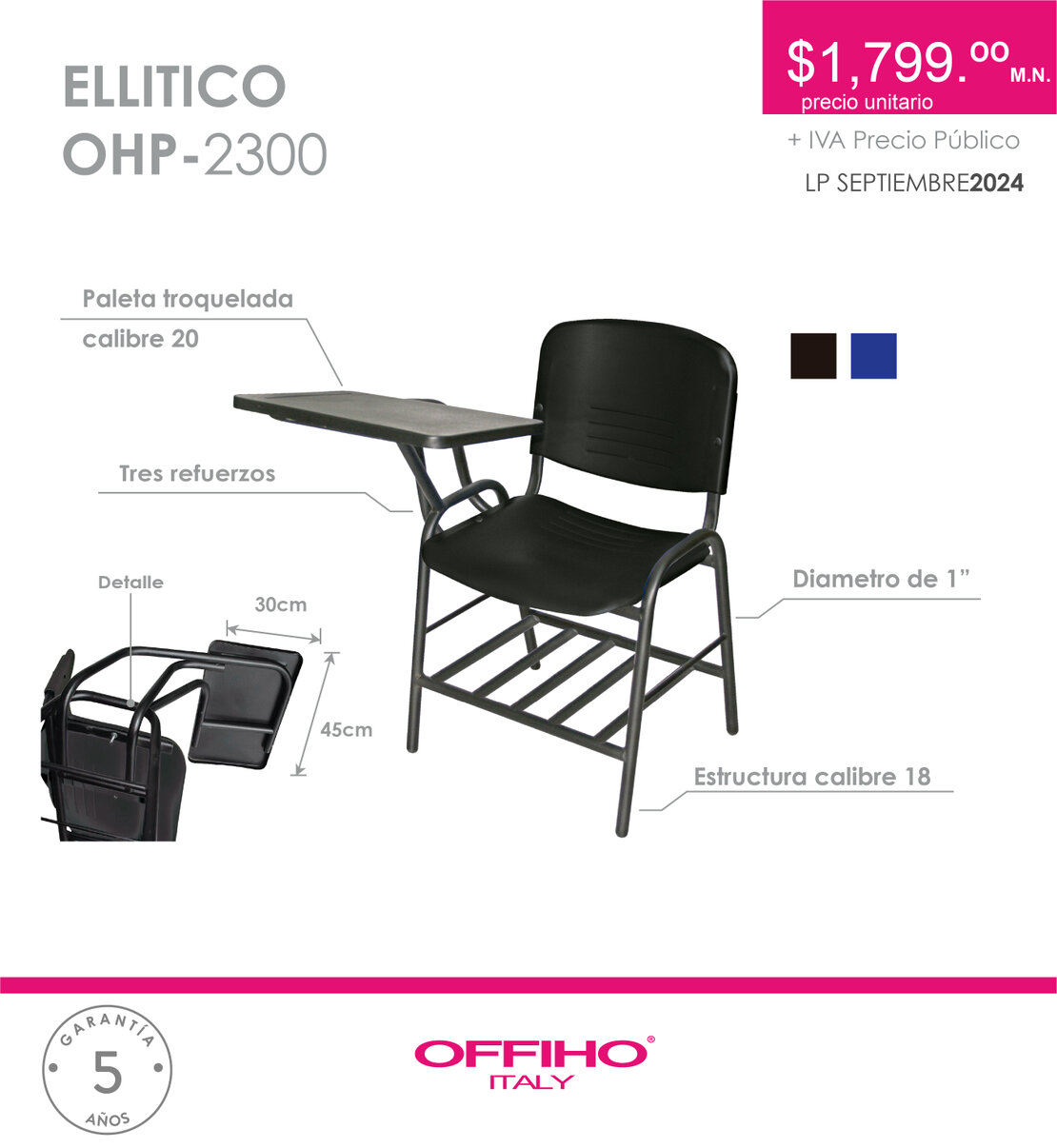 PINTADO, ASIENTO Y RESPALDO SEPARADO DE POLIPROPILENO, PALETA DE POLIPROPILENO COLOR NEGRO. GRANDE REFORZADO CON PLACAS DE SUJECION