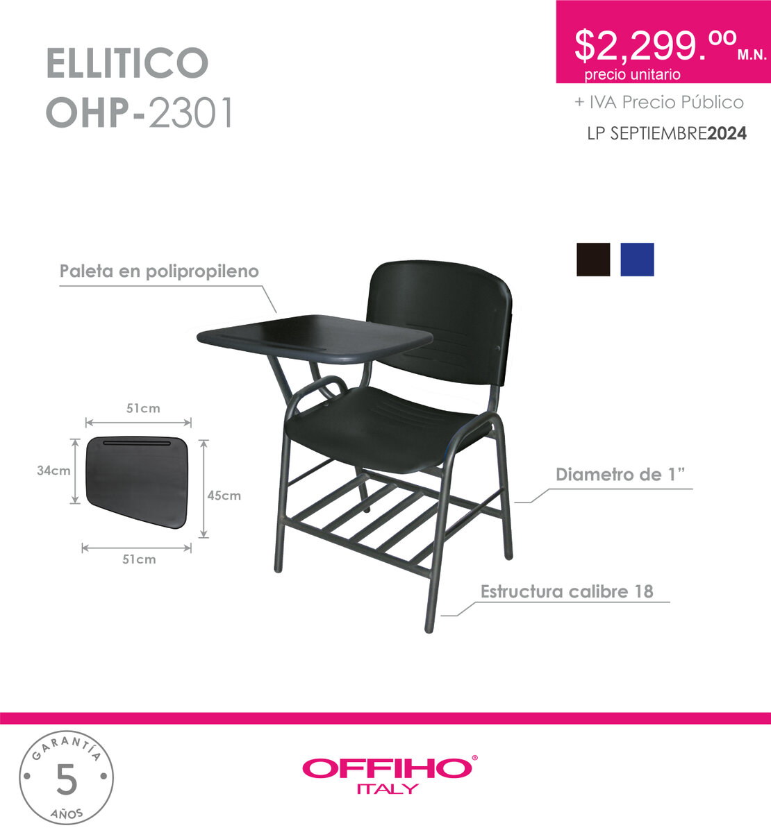 PINTADO, ASIENTO Y RESPALDO SEPARADO DE POLIPROPILENO. PALETA DE POLIPROPILENO COLOR NEGRO.
