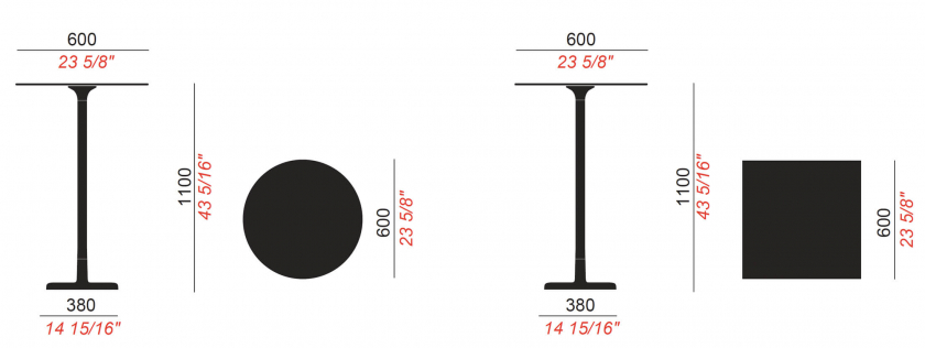 En la versión con sobre redondo, el perfil de la mesa de diseño destaca por su elegancia, gracias al contraste entre el tablero fino y la robusta base de hierro fundido. Los tableros estándares, de 60 a 80 cm de diámetro, son proporcionales a la base. La base de hierro fundido interactúa de forma novedosa con los sobres en versión cuadrada de Alfiere, manteniendo un aspecto equilibrado tanto en el modelo de 60 como en el de 70 cm.