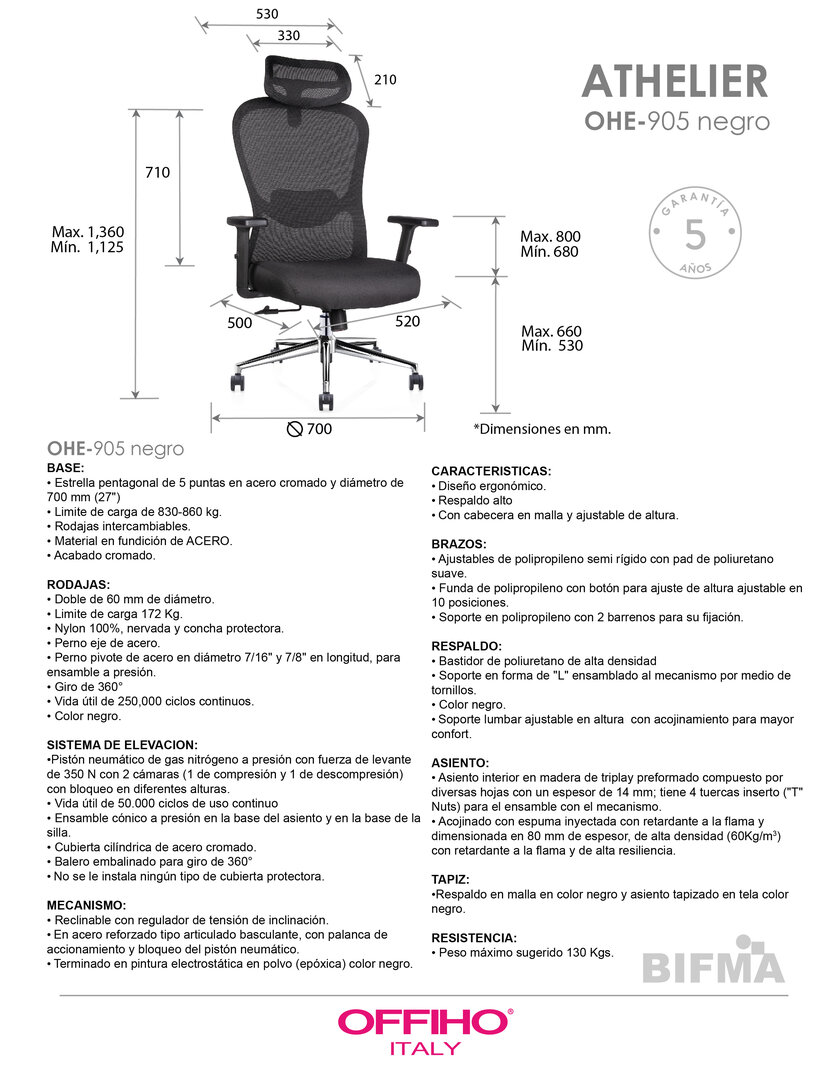 mecanismo: en acero reforzado tipo rodilla articulado (knee-tilt) con sistema de reclinación y palanca de bloqueo, perilla de regulación de tensión para el sistema de reclinación y palanca de bloqueo para la posición de inclinación del respaldo (contacto permanente). brazos: de poliuretano semi-rígido con soporte de acero y de 7 posiciones.respaldo: en malla de diseño ergonómico con cabecera acojinada y tapizada.asiento: hule espuma laminado flexible con densidad de 30 kgs/m3 y alta resilencia.tapiz: respaldo de malla de color negro y asiento en soft revolving leather. peso máximo de resistencia: 120 kgs. aproximadamente.